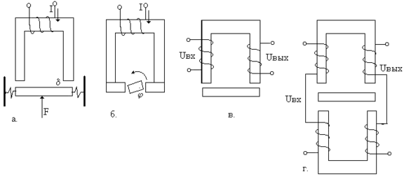 Рис. Датчики перемещений (б) – угловых перемещений. ( в) - линейных перемещений, (г) - и дифференциальная схема.