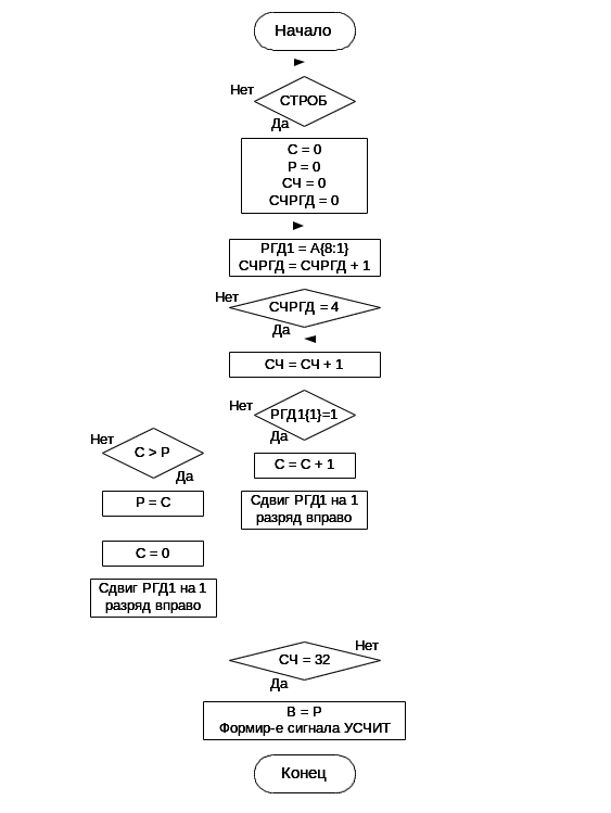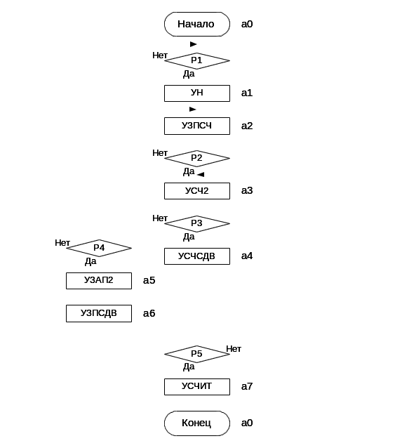 | M2 | УЗПСЧ: | РГД1:=A, СЧРГД:=СЧРГД+1; |