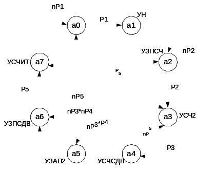 отображаются в состояния автоматов, условия P1, P2, P3, P4, P5 определяют значения входных сигналов, а управляющие сигналы - значения выходных сигналов автоматов.