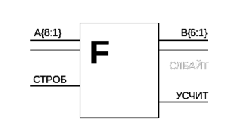 Примем, что источник входного кода гарантирует правильность выставления информации во время действия стробирующего импульса СТРОБ. По окончании обработки устройством каждого поступающего на вход байта устройством должен быть сформирован сигнал СЛБАЙТ ("следующий байт"). После обработки всего входного кода должен вырабатываться сигнал УСЧИТ, позволяющий следующему устройству считать выходные данные с проектируемого устройства.