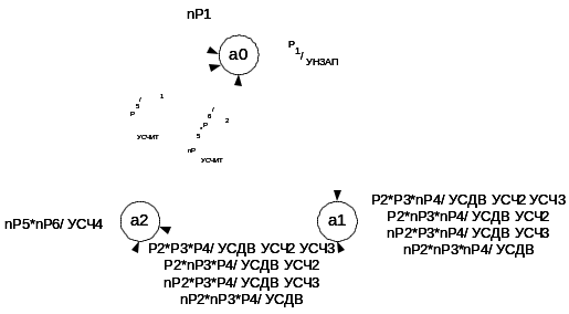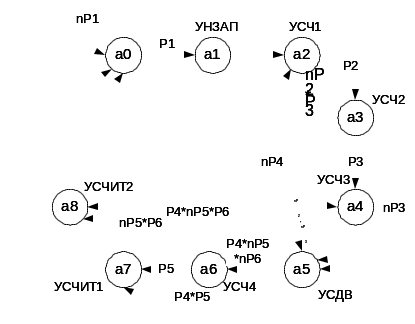 отображаются в состояния автоматов, условия P1, P2, P3, P4, P5, P6 определяют значения входных сигналов, а управляющие сигналы - значения выходных сигналов автоматов.