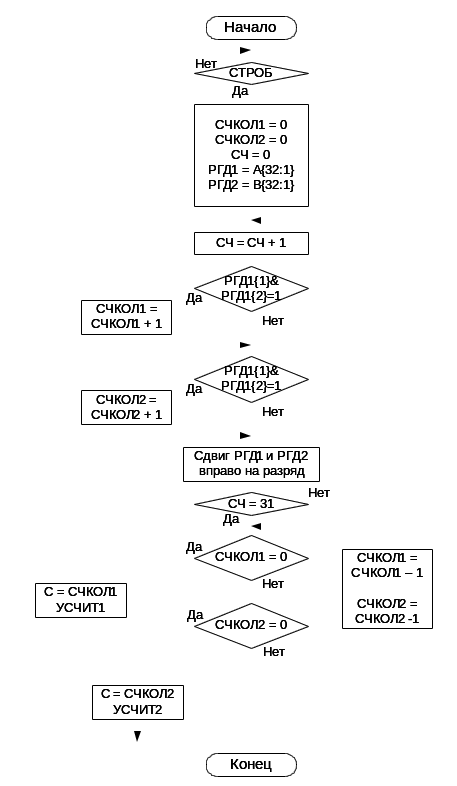 | УНЗАП: | СЧКОЛ1:=0, СЧКОЛ2:=0, СЧ:=0; РГД1=A{32:1}, РГД2=B{32:1} | |