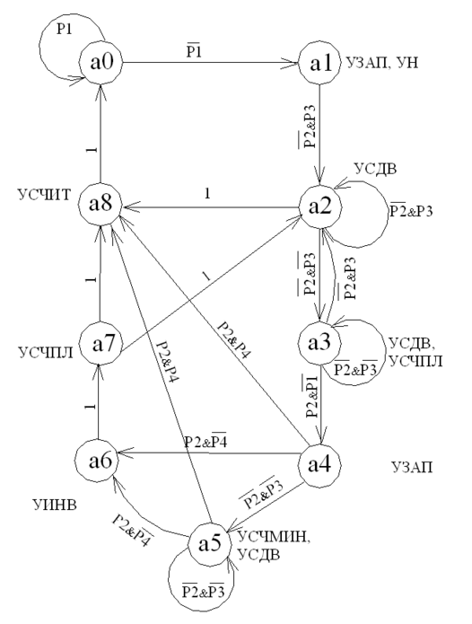 | 0 1 2 3 4 5 6 7 8 9 10 11 12 13 14 15 16 17 18 | М1 М2 М3 М4 М5 М6 М7 М8 | УЗАП, УН УСЧПЛ УСДВ УЗАП УСЧМИН УСДВ УИНВ УСЧПЛ УСЧИТ | если Р1, то М1 если Р2,то М4 если Р3, то М3 идти к М2 если Р1, то М4 если Р2, то М7 если Р3, то М6 идти к М5 если Р4, то М8 конец |
