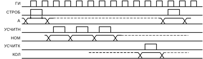 УСЧИТК – выходной осведомительный сигнал, активное значение которого показывает, что преобразования выполнены и сформировано значение выходного сигнала КОЛ{4:0}, соответствующее входному сигналу A{47:0}, то есть подсчитано число комбинаций вида 101 и выданы через шину НОМ{5:0} все номера нулей.