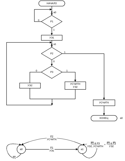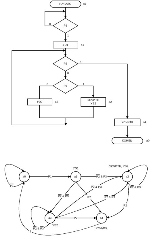 Построим УА с жесткой логикой как конечный автомат. Рассмотрим варианты автомата Мура и автомата Мили и построим для них отмеченные схемы алгоритма и графы переходов и выходов.