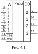 качестве такого преобразователя будем использовать микросхему программируемой логической матрицы КР556РТ4, изображенную на рис. 4.1, которая совместима с ТТЛ-элементами и обеспечивает задержку не более 70 нс. Запрограммировав эту ПЛМ по приведенной выше таблице, получим нужный нам преобразователь 8-разрядного кода в 4-разрядный.