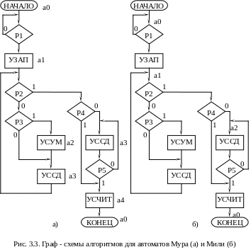 Управляющий автомат с жесткой логикой будем реализовывать в виде конечного автомата. На рис. 3.3 представлены граф - схемы алгоритмов для автоматов Мура (a) и Мили (б), соответствующие микропрограмме.