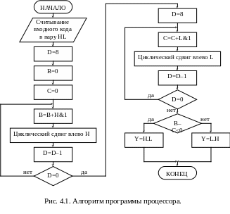 лгоритм программы, реализующей функции заданного устройства, приведен на рис. 4.1. Программа реализующая данный алгоритм на микропроцессоре КР580ВМ80А приведена в таблице 4.1. Предполагается, что на шину данных процессора подаётся сначала старший байт слова, а затем младший. Аналогично представляется выходное слово.