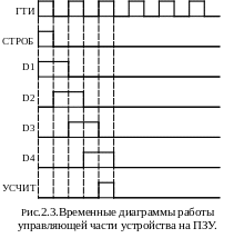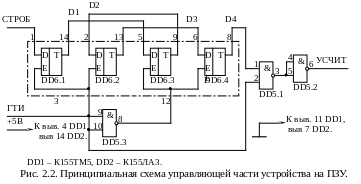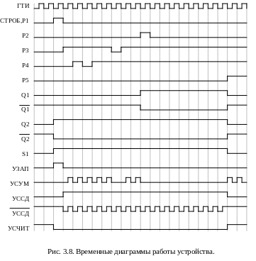 Схема задержки на два такта реализована на четырёх D-триггерах (DD6), и трёх логических элементах (DD5.1 и DD5.2). Каждый из триггеров записывает информацию с входа D если на входе С присутствуют сигнал высокого уровня. При низком уровне сигнала на входе С триггер не меняет своего состояния. Таким образом триггер DD6.1 при приходе сигнала СТРОБ растягивает его до прихода следующего тактового импульса (сигнал D1). Триггеры DD6.2 – DD6.4 реализуют задержку сигнала D1 на полтакта каждый, так как тактовые сигналы на последующий триггер подаются в противофазе с предыдущим. Как видно из временных диаграмм работы управляющей части устройства сигнал УСЧИТ является коньюнкцией сигналов D4 и ГТИ. Операция коньюнкции осуществляется на двух элементах типа И-НЕ (DD5.1 и DD5.2). Элемент DD5.3 выполняет инверсию сигнала ГТИ.