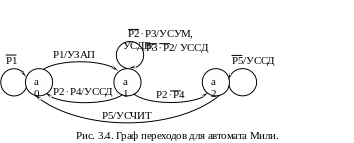 удем реализовывать управляющее устройство в виде автомата Мили, так как он имеет всего три состояния и исполняется на двух триггерах (автомат Мили имеет пять состояний). Граф переходов для автомата Мили, полученный из граф-схемы алгоритма, изображен на рис. 3.4.