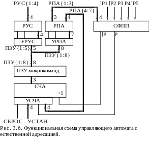 Микрокоманды переписывается из ПЗУ микрокоманд по адресу, находящемуся в счётчике адреса (СЧА). Начальный адрес (УСТАН) устанавливается сигналом СБРОС, и управляющий автомат ожидает прихода сигнала СТРОБ (Р1) для продолжения работы, а адрес перехода устанавливается (РПА{4:7}) признаком перехода (Р). УСЧА – схема управления счётчиком СЧА.