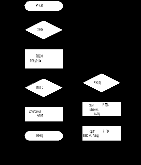 Блок-схема алгоритма по выбранному варианту изображена на рис. 3.1. Соответствующее этой блок-схеме операционное описание синтезируемого устройства представлено на рис. 3. 2. Сигналы УЗВХ и УЗВЫ эквивалентны и их можно заменить сигналом УЗАП. Проверку на ноль регистра РГВХ можно осуществить с помощью операции ИЛИ-НЕ. Текст микропрограммы, учитывающей вышесказанное, представлен на рис. 3. 3. Регистр входного кода (РГВХ) сдвигается влево, в старший разряд при этом заносится ноль. Выходной регистр сдвигается вправо, в младший разряд которого также заносится ноль.