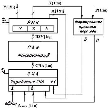 В реальных микропрограммах безусловные и условные переходы встречаются далеко не в каждой микрокоманде. Поэтому в ряде случаев целесообразно строить УУ с использованием принципов естественной адресации. При естественной адресации микрокоманды делятся на операционные и управляющие, которые различаются по биту признака микрокоманды (ПРМК). За операционной микрокомандой закрепляется функция генерирования управляющих сигналов и передача управления "естественным образом" следующей по адресу микрокоманда. Управляющая микрокоманда не генерирует управляющих сигналов, она выполняет функцию передачи управления в нарушение "естественного" (друг за другом по адресу) следования микрокоманд.