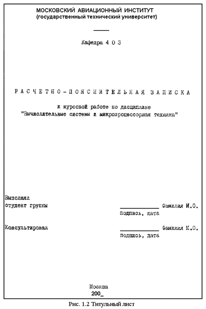 Записка вкладывается в обложку из ватмана и брошюруется. Лицевая сторона обложки является титульным листом и оформляется так, как показано на рис. 1.2. При сквозной нумерации страниц в записке этот лист считается первой страницей. Титульный лист подписывается студентом и преподавателем.