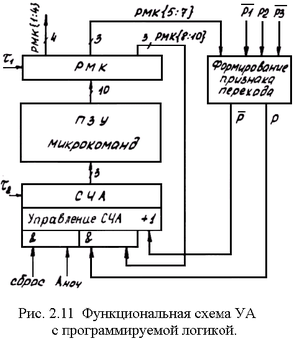 На рис. 2.11 изображена функциональная схема УА с принудительной адресацией. Управляющие сигналы формируются регистром микрокоманды (РМК), в который микрокоманда переписывается из ПЗУ микрокоманд по адресу, находящемуся в счетчике адреса (СЧА). Регистр РМК тактируется последовательностью 1, а счетчик адреса СЧА - последовательностью 2 : 1 & 2 = 0.