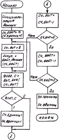 Схема алгоритма изображена на рис. 2.15. Алгоритм включает в себя два цикла: подсчет числа единиц в текущем байте и накопление единиц при просмотре всех байтов. Входной код размещается в массиве БАЙТ_ДАННЫХ. Положение текущего байта в массиве определяется счетчиком байтов СЧ_БАЙТ. Положение текущего бита этого байта, предварительно помещенного в аккумулятор, определяется СЧ_БИТ.