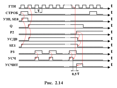 При его формировании необходимо организовать такой временной интервал между последним импульсом УСЧ1 и УСЧИТ, чтобы гарантировать завершение всех переходных процессов в последовательном счетчике на К555ИЕ19 (60 нс на четыре разряда, 90 нс на шесть разрядов). Работа устройства демонстрируется эпюрами напряжений на рис. 2.14. Суммарная задержка фронта импульса УСЧИТ относительно среза импульса УСЧ1 - не менее 100 нc. Таким образом, к началу импульса УСЧИТ все переходные процессы в счетчике DD13 завершатся, и выходной код В{1:6} установится.