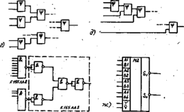 Реализация схем свертки по "И" и "ИЛИ" на микросхемах K155 встречает значительные трудности, поскольку схемы "И" и "ИЛИ" выпускаются только в двухвходовом варианте. Действительно, для построения схемы на п входов потребуется п-1 двухвходовых схем. Эти схемы могут соединяться либо пирамидально, либо цепочечно, как это показано на рис. 3,г,д. Некоторый выигрыш может быть получен при использовании восьмивходовых схем "И-НЕ", но для этого реализуемую функцию необходимо представить в базисе Функции "Штрих Шеффера" [I]. На рис. 3,е изображена шестнадцативходовая схема свертки по "И", логическое выражение которой было получено в результате следующих преобразований: