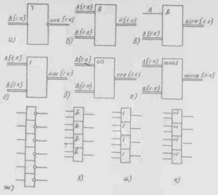 Условное обозначение схем поразрядного преобразования приведено на рис. 2, а-е. Имя выходных шин отражает характер преобразования - инверсия, коммутация, и, или, совпадение, несовпадение. На том же рисунке приведены микросхемы K155, из которых могут быть собраны реальные схемы требуемой разрядности.