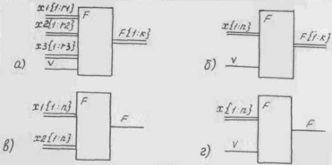 Рис. 1. Условное изображение операционного элемента комбинационного типа: а - с тремя входными шинами и стробирующим сигналом; б - с одной входной шиной и стробирующим сигналом; в - с одноразрядным выходом; г - с одноразрядным выходом и стробирующим сигналом.