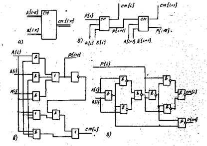 Условное обозначение сумматора представлено на рис. 6,а. Комбинационные сумматоры чаще всего строятся как регулярные структу-ры состоящие из однотипных разрядных схем, соединенных последовательно (рис. 6,6). Каждый разряд сумматора имеет три входа (разряд кода A(i), разряд кода B(i), перенос из предыдущего разряда P(i)) и два выхода (разряд суммы CM(i), перенос в следующий разряд Р(i+1 )) и может быть описан системой логических выражений