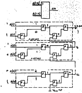 В простых устройствах схемы формирования признаков арифметического отношения строятся как самостоятельные операционные элементы. Синтез схем этого класса рассмотрим на примере построения схемы "больше": БОЛ = A{1:n} > B{1:n}.
