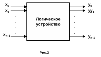 Пусть на входе некоторого логического устройства действует m логических переменных Х0 Х1… Х m – 1, а на его выходе возникают n логических функций Y0 Y1…Y n - 1 , каждая из которых связана с этими логическими переменными (рис.2).