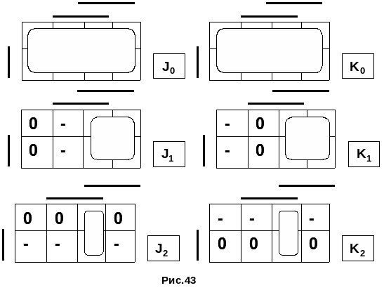 Если для реализации этого счетчика использовать три синхронных JK-триггера, то для получения функций возбуждения составим карты Карно, используя (35), которые представлены на рис.43.