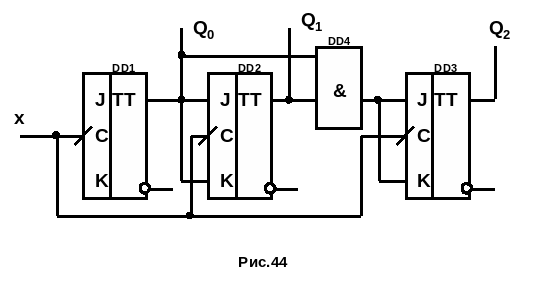 В соответствии с (38) функциональная схема двухразрядного реверсивного двоичного счетчика с последовательным переносом на универсальных JK-триггерах имеет вид, представленный на рис.45.