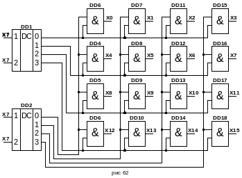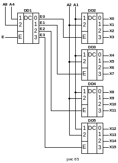 Рассмотрим принцип построения схемы двухступенчатого дешифратора «4-16» на основе дешифраторов «2-4» с входом управления Е (рис. 63).