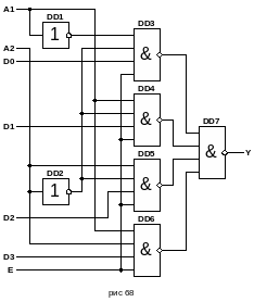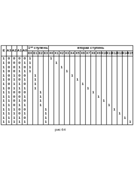 А8 А4, DD2, DD3, DD4, DD5 – вторая ступень, на информационные входы которого поступают младшие разряды общего двоичного кода А2 А1, а на входы управления поступают выходные сигналы дешифратора первой ступени Е0, Е1, Е2, Е3 соответственно. На рис.64 представлена таблица соответствия проектируемого дешифратора, функциональная схема которого представлена на рис. 65.