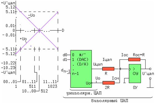 Рис.71. Униполярный ЦАП и его передаточная характеристика
