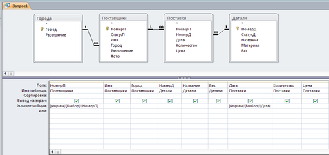 На рис.36 приведен пример запроса, содержащего в строке Условие ссылки на поля формы.