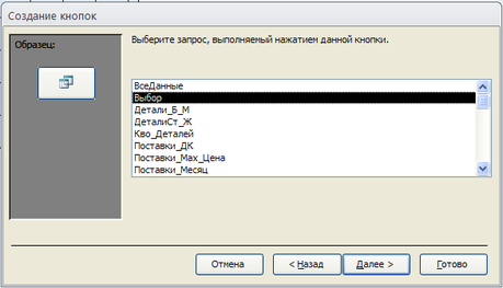 В следующем окне мастера рис.38, нужно выбрать запрос, который должен открываться создаваемой кнопкой.