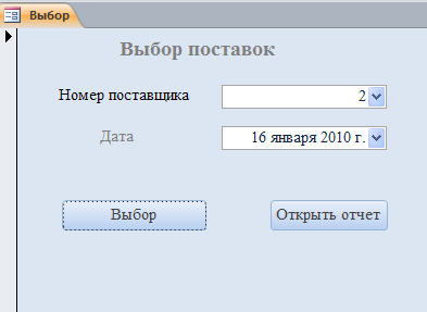 Этот запрос содержит в строке Условия отбора ссылки на поля формы Выбор, и позволяет получить данные о поставках осуществленных определенным поставщиком за определенную дату.