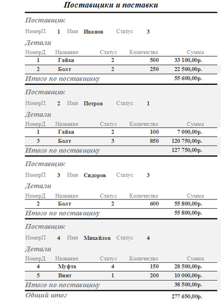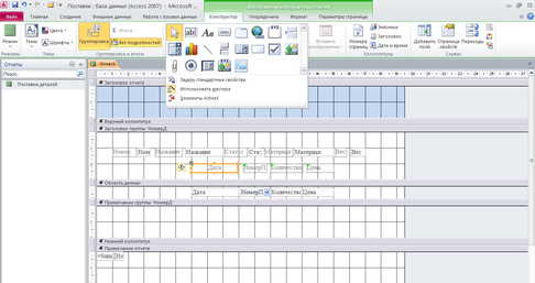 Отчет состоит из нескольких разделов. Для того чтобы правильно создавать отчеты, необходимо понимать назначение каждого раздела. На рис.1 представлен отчет содержащий данные о поставках деталей, открытый в режиме конструктора.