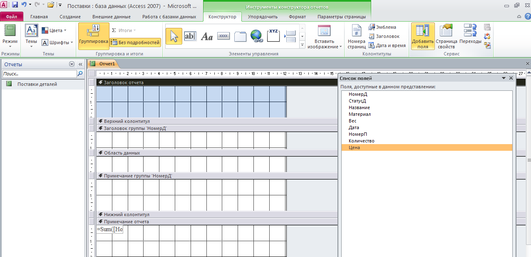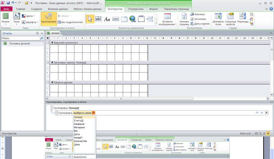 Для того, чтобы данные в отчете были сгруппированы по номеру детали нужно выбрать команду Группировка на вкладке Конструктор рис.7, нажать кнопку Добавить группировку в нижней части отчета и в появившемся списке рис.7 выбрать поле НомерД