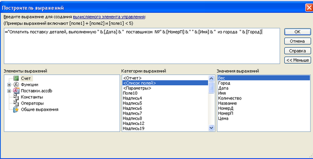 Открыть свойства этого поля, перейти в строку Данные и с помощью Построителя выражений ввести содержимое поля рис.20. Особенностью этого поля является то, что оно состоит из комбинации текста и значений полей.