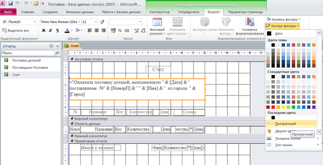 После этого необходимо определить содержимое других элементов отчета рис.21. По умолчанию некоторые элементы отчета имеют видимый контур. Для того чтобы его убрать, нужно выбрать команду Контур фигуры на вкладке Формат рис.21 и выбрать Прозрачный контур фигуры. На этой вкладке можно определить цвет и толщину линий используемых в отчете.