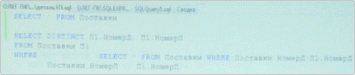 - если за то, что результат подзапроса не идет и EXISTS вернет значение Истина и сведения номер поставщика будет помещены в результат основного запроса и т. д. остальные записи.