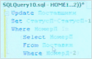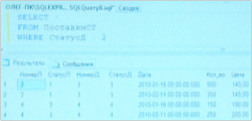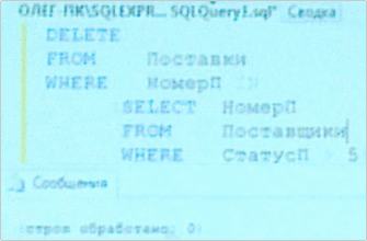 Рассмотрим еще один пример. Необходимо удалить поставки от поставщиков, статус которых > 5.