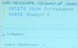 Необходимо удалить сведения о поставщике с номером 6. Пример выполнения этого запроса приведен на рисунке.