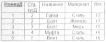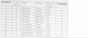 | НомерП | СтатусП | И мя | Г о р о д | Расстояние | НомерД | СтатусП | Наз ва ние | Ма те ри ал | В ес | Д а та | К ол во | Ц е н а |