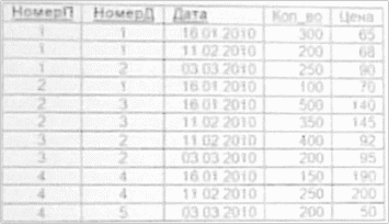 НомерД, НомерП, Дата - Кол_во, Цена