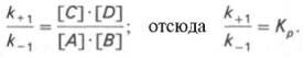 константа равновесия равна произведению концентраций образующихся веществ, деленному на произведение концентрации исходных веществ. Значение константы равновесия обычно находят из соотношения констант скоростей прямой (k+1) и обратной (k– 1 ) реакций, т.е. Кp = k+1/k–1. В состоянии равновесия скорость прямой реакции: v+1 = k + 1[ А ] • [ B ] равна скорости обратной реакции: v–1 = k – 1 [ С ] • [ D ] , т. е. v+1 = v–1 соответственно k+1[А]•[B] = k–1[С]•[D], или