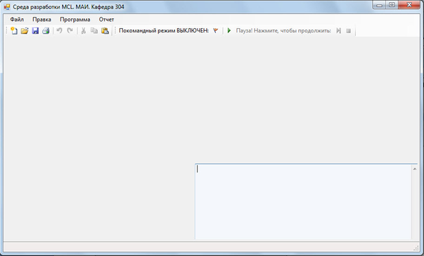 После нажатия кнопки OK загрузится графическая среда разработки. В зависимости от выбранной лабораторной работы слева будет отображен графический элемент управления, представляющий структуру изучаемого устройства, и поле для вывода текстовой информации (рис. 2). Если был выбран пункт «Без графического интерфейса», всю левую сторону займет поле для вывода текстовой информации (рис. 3).