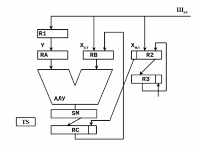 Появляется связь между регистрами R2 и RС для сдвига промежуточного остатка и организован доступ к нулевому разряду регистра R3 для записи очередного разряда частного. Старшая и младшая части промежуточного остатка хранятся в регистрах RB и R2 соответственно. Если промежуточный остаток отрицательный, то делитель переписывается в регистр RA в прямом коде и в очередной разряд частного в регистр R3 записывается 0, если промежуточный остаток неотрицательный, то делитель переписывается в регистр RA в обратном коде и в очередной разряд частного в регистр R3 записывается 1. Регистры SM и R2 используются для организации сдвигов. При сдвиге промежуточного остатка в освободившийся разряд регистра RC заносится очередной разряд делимого. В каждом цикле результат с регистра RC переписывается на регистр RB. Триггер ТS хранит знак результата, который формируется сложением по модулю 2 знаковых разрядов делимого и делителя. Так как деление производится над положительными числами в прямом коде, в случае отрицательных операндов, сначала формируется знак результата и заносится в триггер TS, операнды переводятся в прямой код и только тогда выполняется деление по уже известному алгоритму. Число циклов равно n-1, т.е. семи (без учета пробного вычитания).