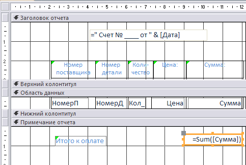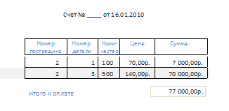 На рис. 43 показана структура отчета представляющего собой счет на оплату поставок. В качестве источника данных для этого отчета используется функция ПоставкиНомерДата.