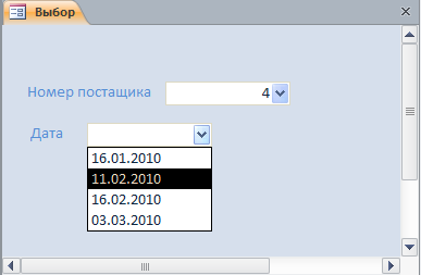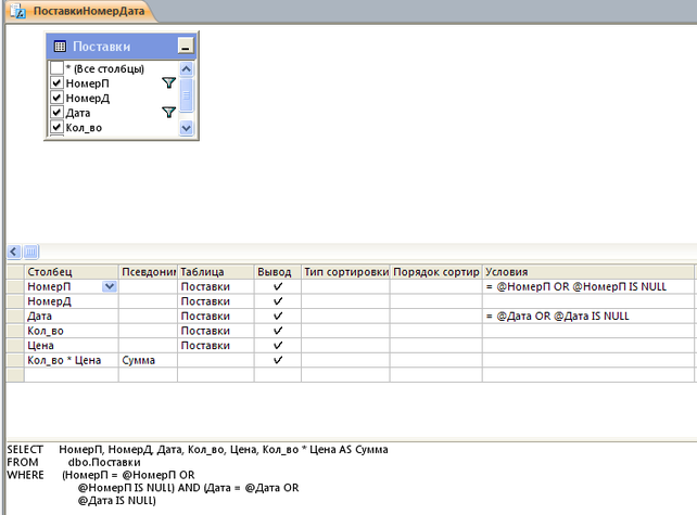 @НомерП int=[Forms]![Выбор]![НомерП], @Дата datetime=[Forms]![Выбор]![Дата]