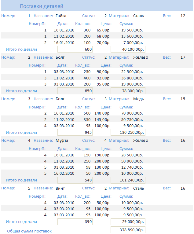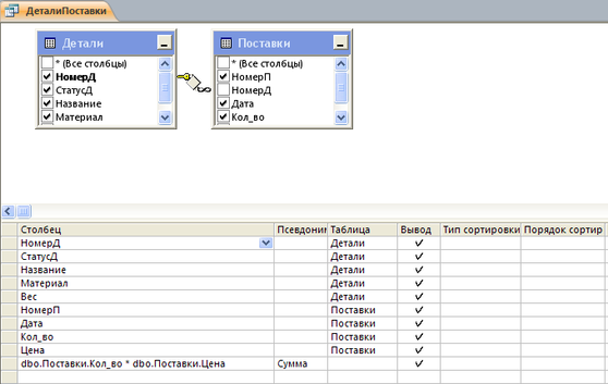В качестве источника данных, для рассматриваемого отчета используется представление ДеталиПоставки, вид которого приведен на рис.28.